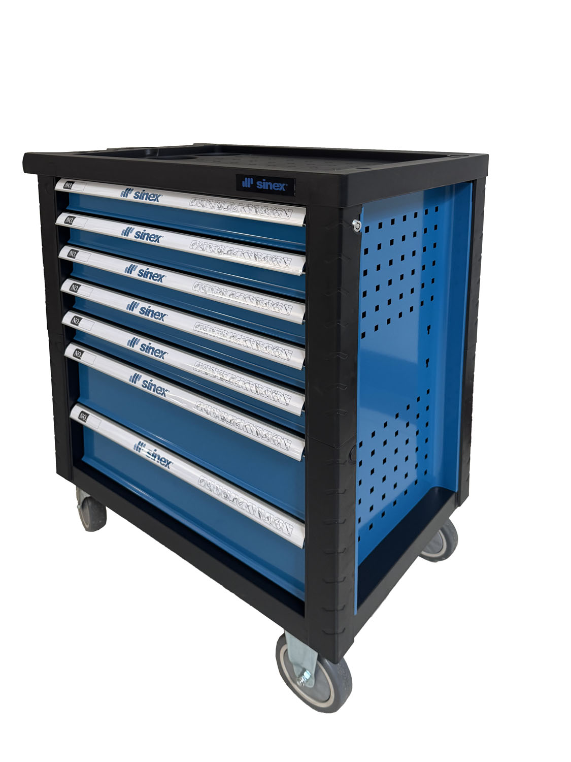- 7 cajones de 530×390 mm, montados sobre guías telescópicas de rodamientos: 5 cajones, altura 60 mm y 2 cajones, altura 140 mm.